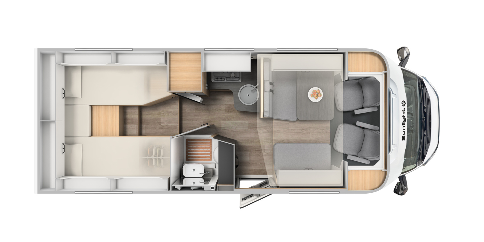 Moderne Ausstattung, komfortable Ausstattung und das ganze in einem Raumwunder unter 7m. Der Sunlight T67 S Adventure besticht durch sein äußerst großzügiges Raumgefühl und die offene Blickachse in den Schlagbereich. Trotz aller Kompaktheit finden vier Personen komfortabel Ihren Schlafplatz.
